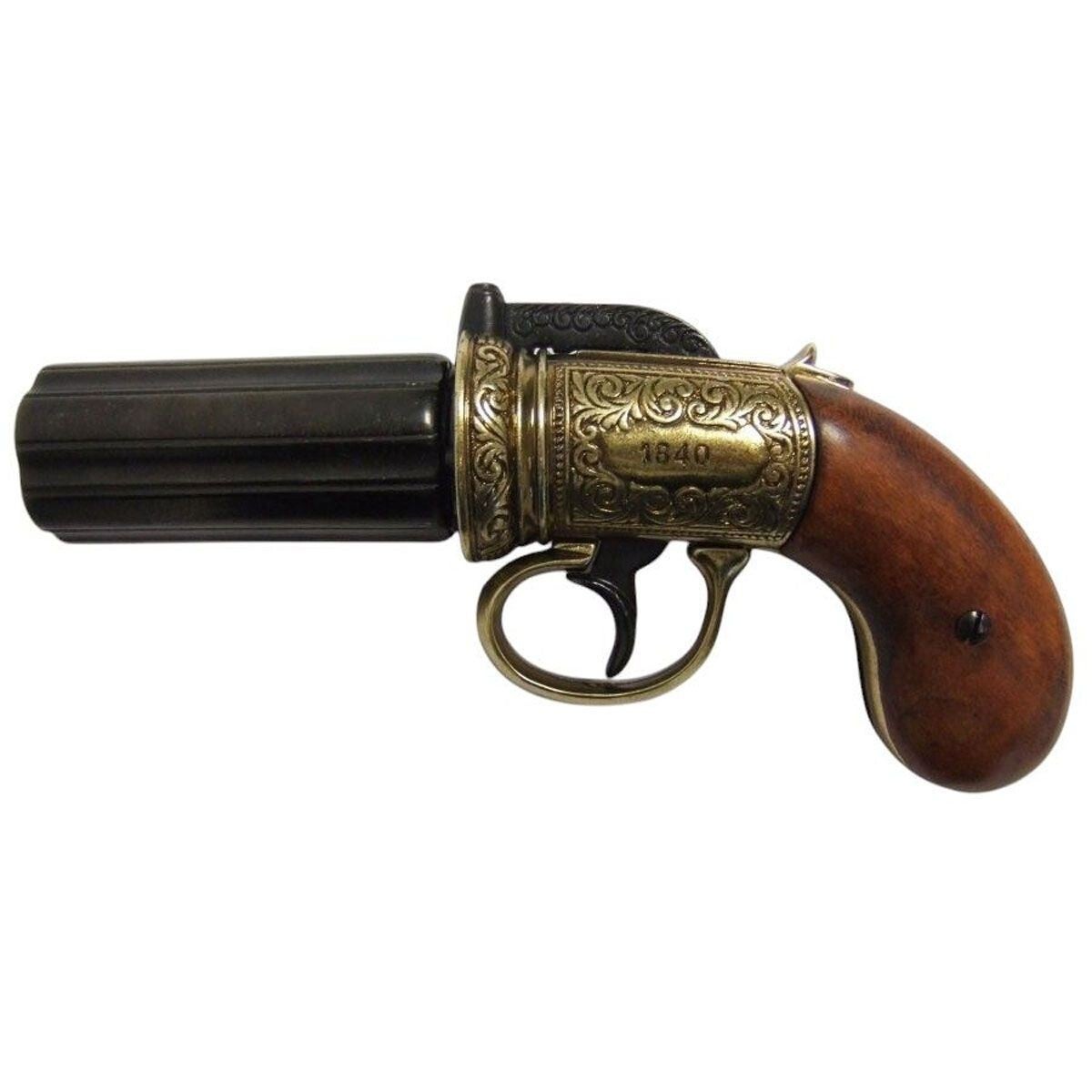 Riproduzione storica del revolver "Pepperbox" a sei canne, sviluppato a Londra intorno al 1840. Questo modello è realizzato in metallo con impugnatura in legno e presenta un meccanismo di sparo funzionante con canne rotanti. Colore brunito/dorato